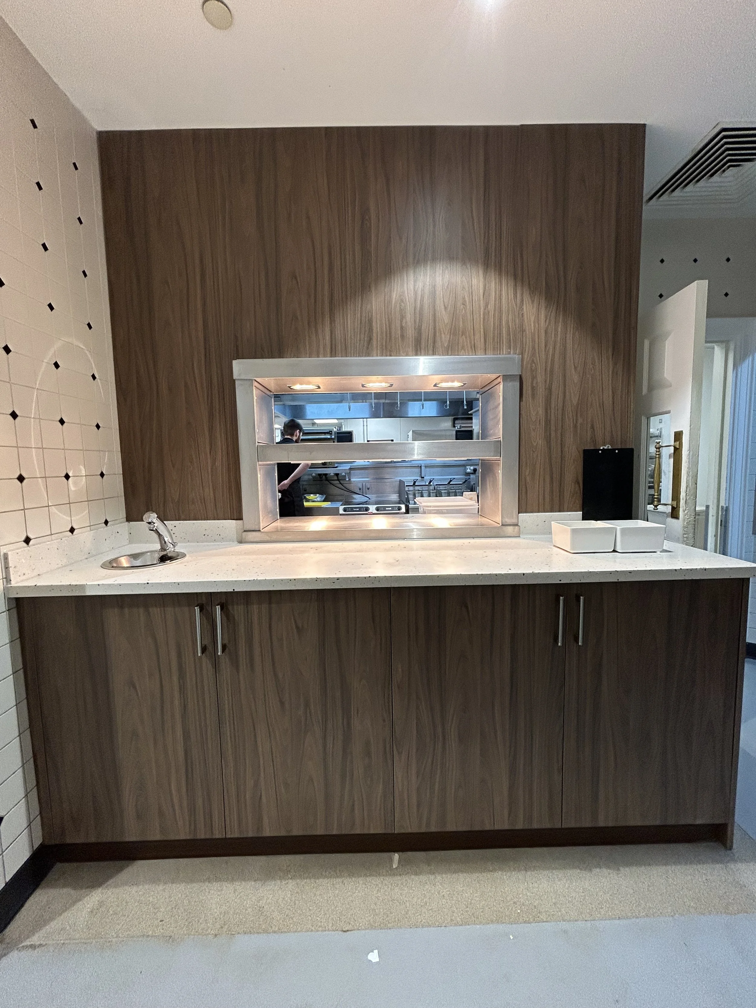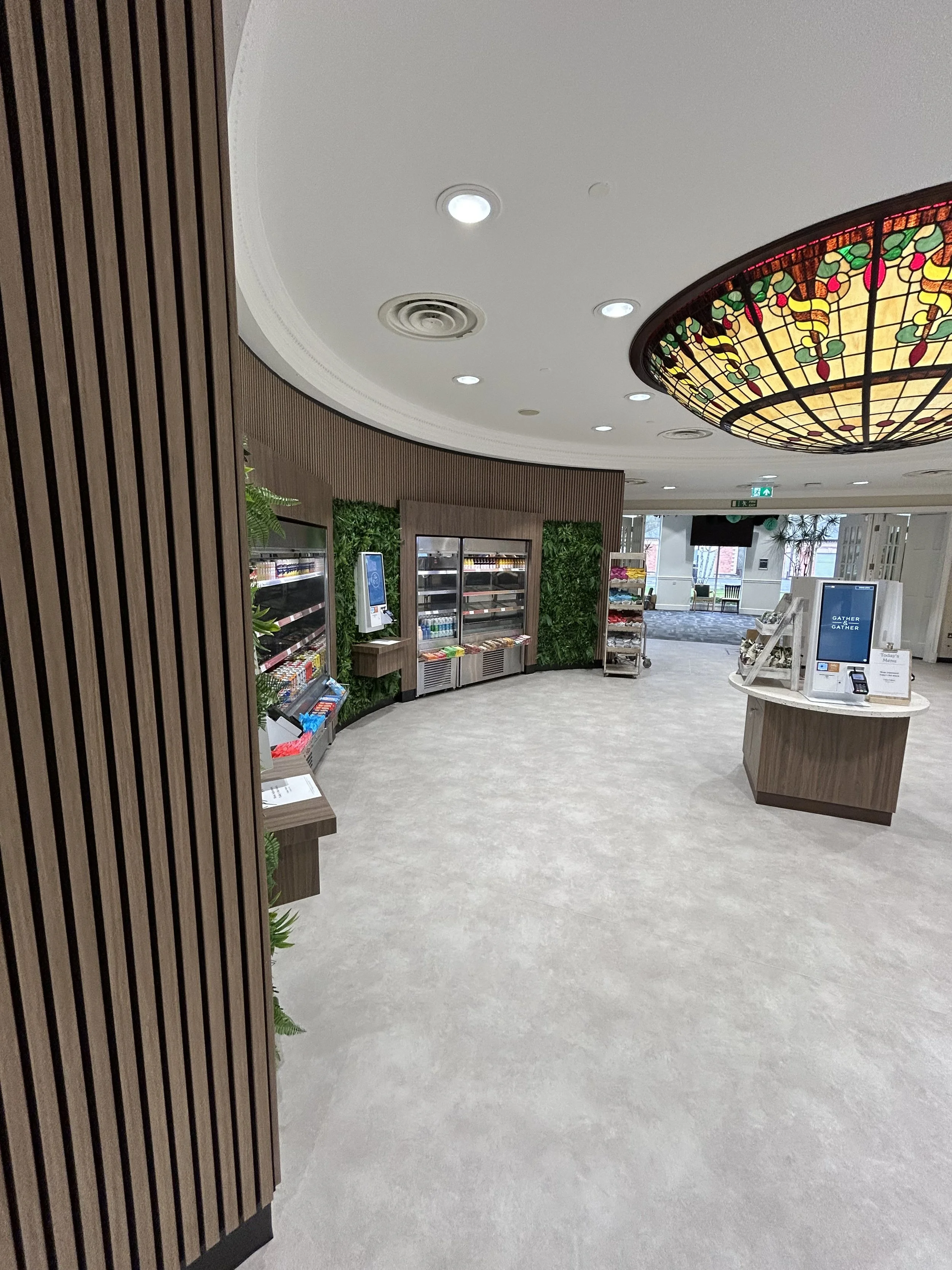 The refurbishment featured a stunning feature wall with integrated chilled displays, bespoke new counters, refurbished existing units, Corian worktops, premium stainless steel fabrication, upgraded cooking equipment and refrigeration, a fire shutter, and a high-quality coffee station.